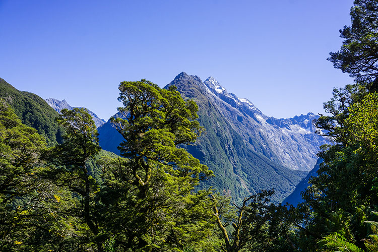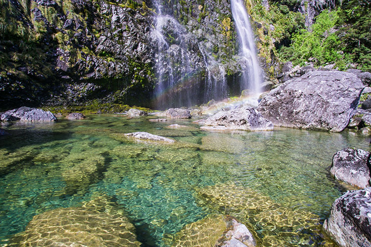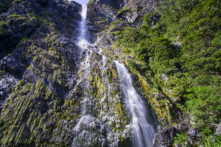 Once at the top of the hill you’ll see some views of the Hollyford Valley below as well as the rugged mountains surrounding Earland Falls. Once at the top the track gets pretty flat – this is a nice relaxing section of the Routeburn Track and before long you’ll be face to face with a massive waterfall.