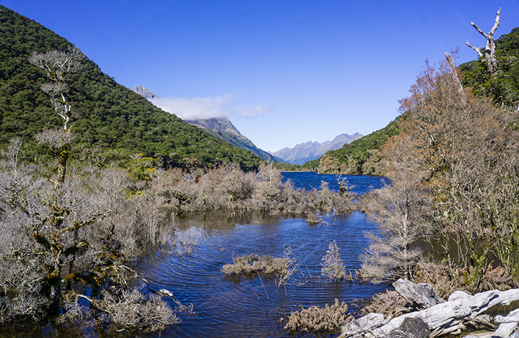 From Earland Falls it’s an easy downhill stroll to Lake Howden. There used to be a hut here, but a landslide in early 2020 destroyed it. Now it’s a picnic area with tables and a big grass. It’s a good spot to rest for a little while before tackling the last section of the Routeburn Track.